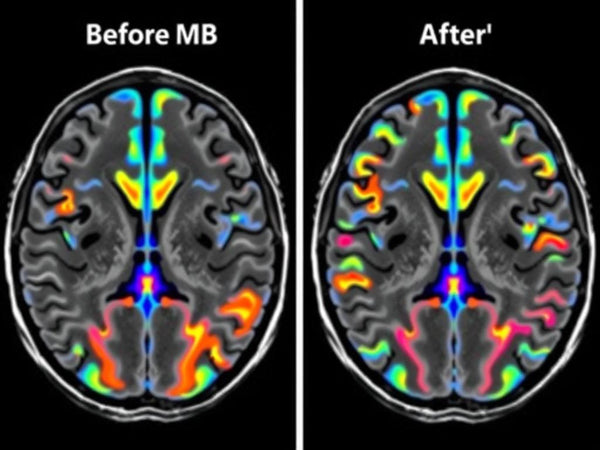 Brain activity comparison before and after methylene blue administration, showing increased activity in cognitive regions.