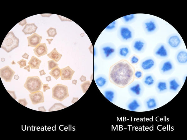 Microscopic comparison of untreated skin cells (left) versus methylene blue-treated cells (right) showing reduced signs of cellular aging