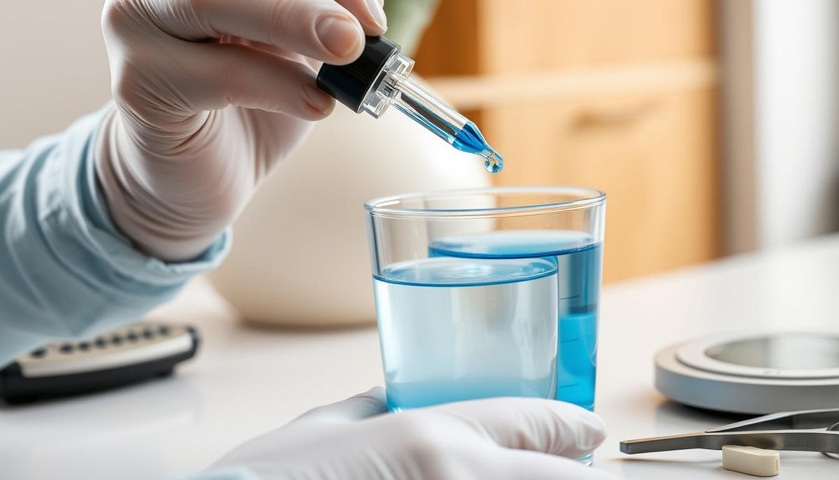 Carefully measuring a precise dose of methylene blue solution with a graduated dropper.